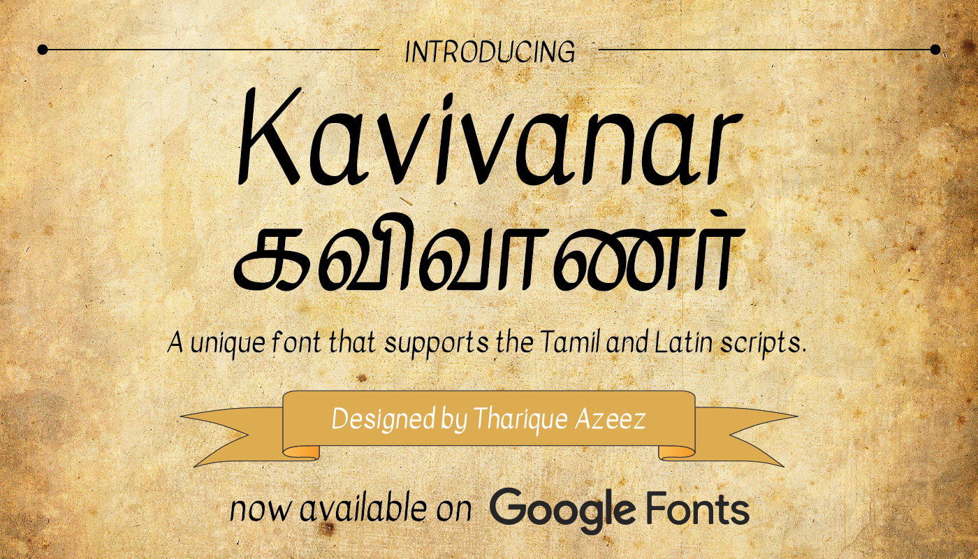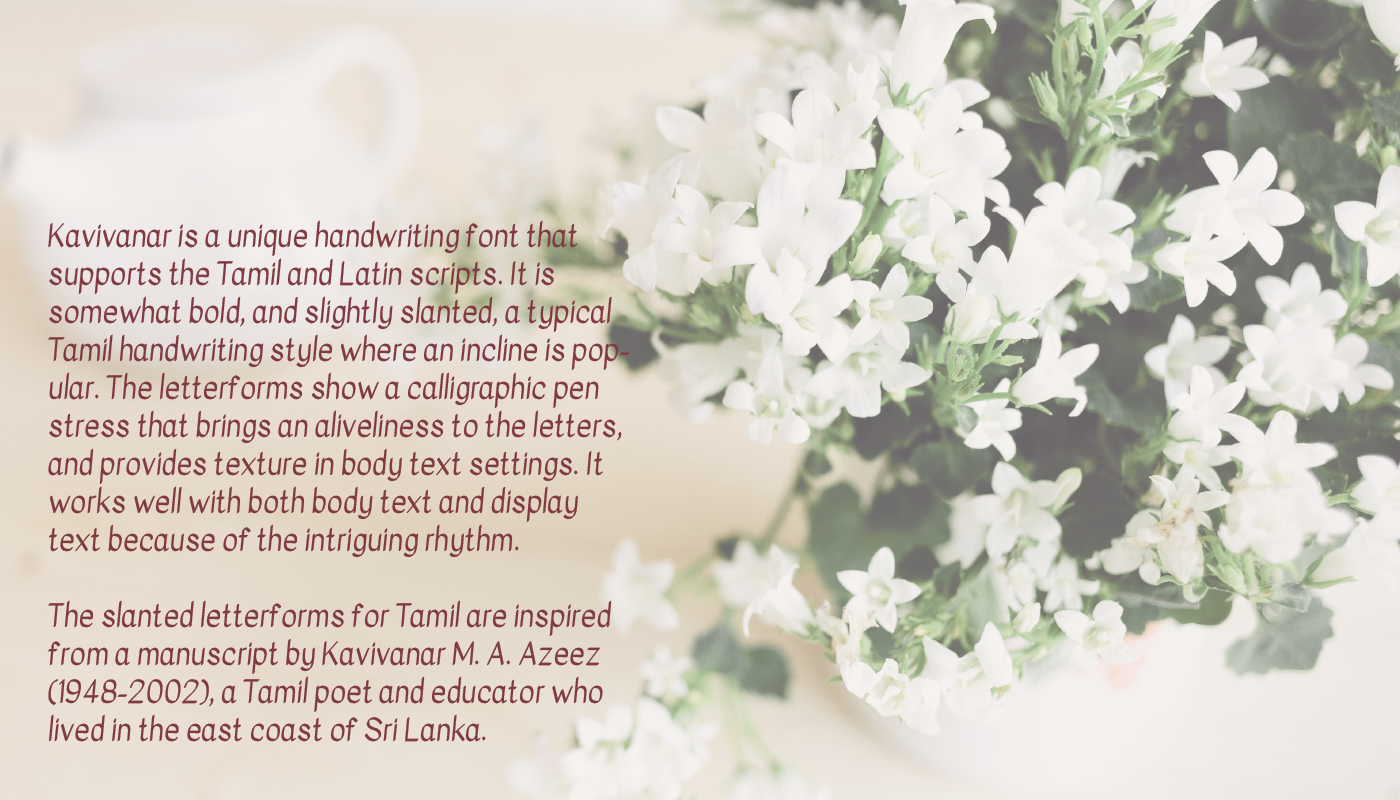 The slanted letterforms for Tamil are inspired from a manuscript by Kavivanar M. A. Azeez (1948-2002), a Tamil poet and educator who lived in the east coast of Sri Lanka.